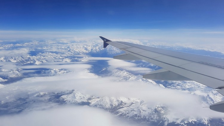Le trajet s’enchaîne facilement, entre montagne et mer. A peine le temps d’un petit somme pour rattraper ma courte nuit que je vois déjà apparaître le début de la chaine montagneuse des Alpes en mettant le nez au hublot. Nous les surplombons pendant un petit moment. Elles sont immenses et s’étendent à perte de vue, leurs sommets enneigés fondus dans les couches éparses des nuages. Vu d’ici, c’est vachement facile de les survoler. Une fois en bas, ça le sera un peu moins pour les traverser !
