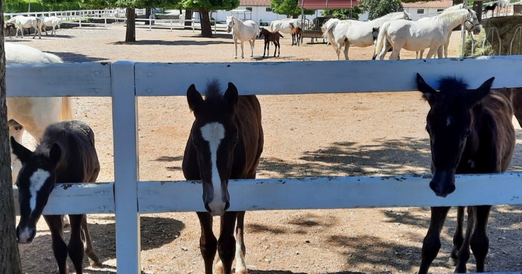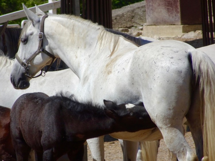 A l’entrée, une vingtaine de juments suitées accueillent les visiteurs avec leurs poulains fraichement nés. Belle stratégie de sociabilisation de ce petit monde, tant au sein du troupeau qu’auprès des visiteurs qui viennent les gratouiller. D’ici quelques temps, 80% d’entre eux seront destinés au dressage classique, 20% à l’attelage.