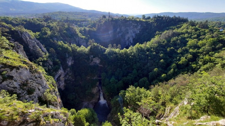 J’y découvre l’un de ses aspects les plus marquants avec les dolines, sortes de dépressions circulaires qui peuvent aller de quelques mètres à plusieurs centaines de mètres de diamètre. La doline d’effondrement la plus haute de la région fait 163m et se situe sur mon chemin. Elle m’offre un beau panorama face à elle au petit matin, son torrent bouillonnant avec force en bas de ses roches.