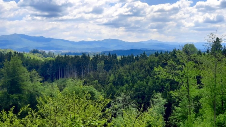 Des forêts à perte de vue, et leurs palettes de verts qui changent au gré de la danse entre le soleil et les nuages. Dégradés de nuances et de niveaux vers l’horizon, les derniers plans des montagnes perdus dans les brumes.