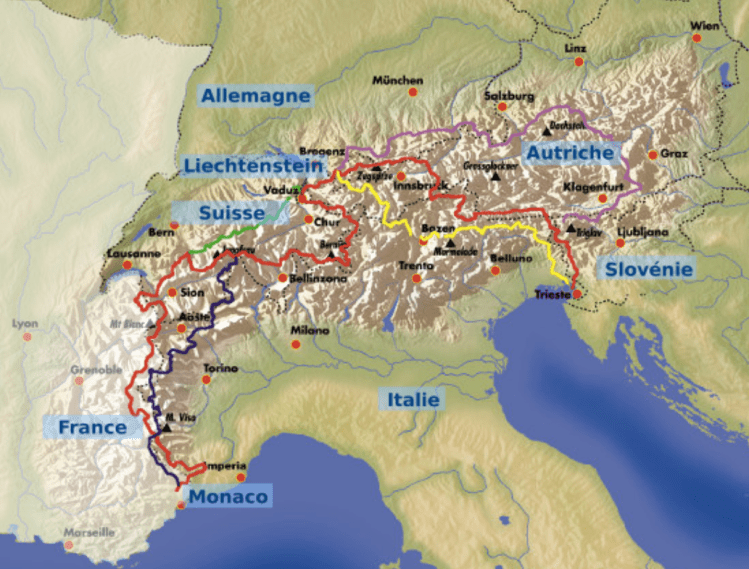 Le plus long tracé traverse les Alpes de part en part, reliant Trieste (Italie) à Monaco en 161 étapes sur 2500kms. De l’Adriatique à la Méditerranée, à travers les plus beaux sommets de huit pays : Italie, Slovénie, Autriche, Allemagne, Liechtenstein, Suisse, France et Principauté de Monaco.
