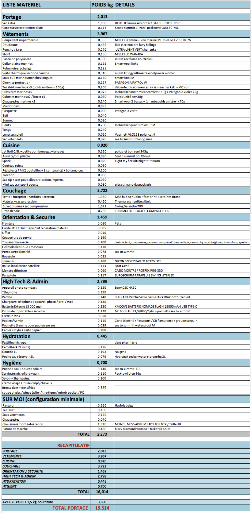Mon retour d’expérience est globalement très positif sur les équipements que j’avais jusqu’alors pour mes sorties vélo et/ou randos. Quelques renouvellements, principalement pour optimiser le poids de mon paquetage ou gagner un peu en volume, et le voici qui prend forme ; l’indispensable inventaire excel, gardien et juge de paix dans la chasse aux grammes…